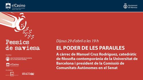 El cicle “Pessics de Saviesa” finalitza aquest dijous, 29 d’abril, amb la tercera de les tres conferències que han conformat el nou cicle dedicat a reflexionar sobre el “concepte de poder”. Es tracta de la conferència titulada “El poder de les paraules”, que anirà a càrrec del filòsof Manuel Cruz Rodríguez.