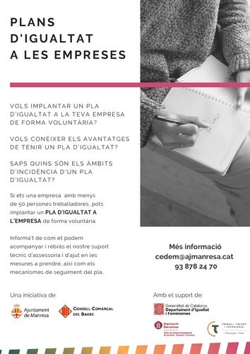 El consistori ofereix assessorament i acompanyament a companyies de menys de cinquanta treballadors i treballadores que opten per elaborar un pla d’igualtat de gènere. El servei inclou una diagnosi interna, suport tècnic i propostes de mesures a establir. Les companyies que estiguin interessades a sol·licitar-lo, poden adreçar-se a Desenvolupament Local del consistori trucant al telèfon 93 878 24 70 o bé enviant un correu electrònic a cedem@ajmanresa.cat.
