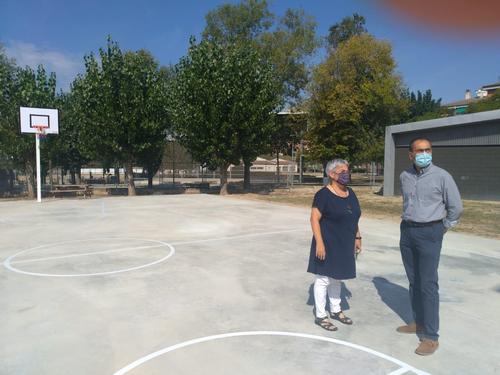 - Fotografia. El regidor d’Ensenyament de l’Ajuntament de Manresa, Josep Gili Prat; i la directora de l’escola Serra i Hunter, Anna Maria Torra Bitlloc, comprovant les millores fetes a la pista poliesportiva de l’escola Serra i Hunter.