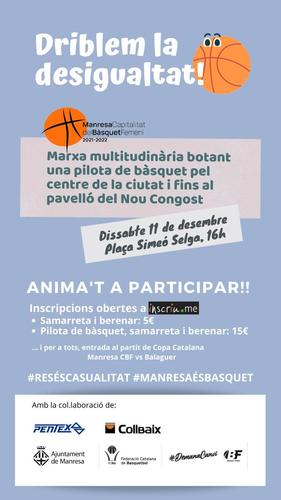 Des d’avui ja es poden fer les inscripcions a la Marxa “Driblem la Desigualtat”, que se celebrarà el dissabte 11 de desembre, i que és una de les activitats populars programada des de l’eix “Participem” dels actes de Manresa Capitalitat del Bàsquet Femení.